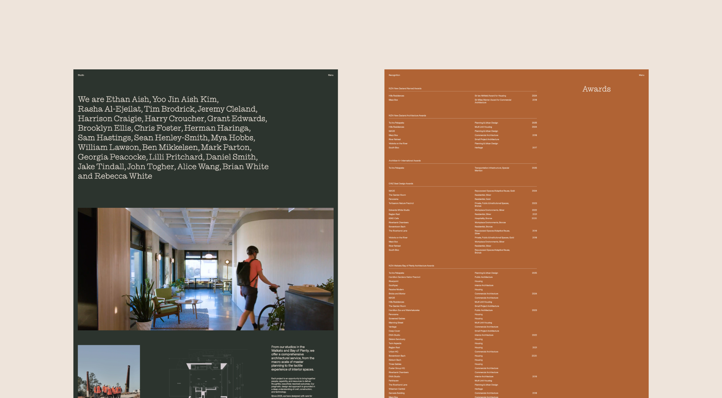 The identity is anchored by a refined wordmark set in Ionic No. 5 Light, supported by Basel Grotesk for long-form clarity and legibility. The typographic system balances precision with subtle expression, reflecting the studio’s architectural approach. A restrained colour palette draws from material and landscape references common across their work, while allowing for more warmth and personality than the conventional black-and-white architectural norm. These elements are carried directly into the website design. The interface is deliberately restrained, using disciplined grids, generous spacing and clear hierarchy to let projects lead. Each client group page opens with a philosophy statement that establishes intent, then reduces on scroll to a concise three to four word expression, reinforcing clarity and focus. The website’s content structure was rebuilt around a flexible, filterable CMS that allows all projects to live within a single system. This provides consistency while accommodating variation in project scale and content. Projects can be short or detailed, and include photography, video, sketches, floorplans, citations and commentary without breaking the overall structure. Video plays a stronger role across the site, adding movement and depth, and the platform now provides a clear home for the studio’s podcast and ongoing conversations. The studio page places people at the forefront, reinforcing the idea that the work is shaped by the individuals behind it.