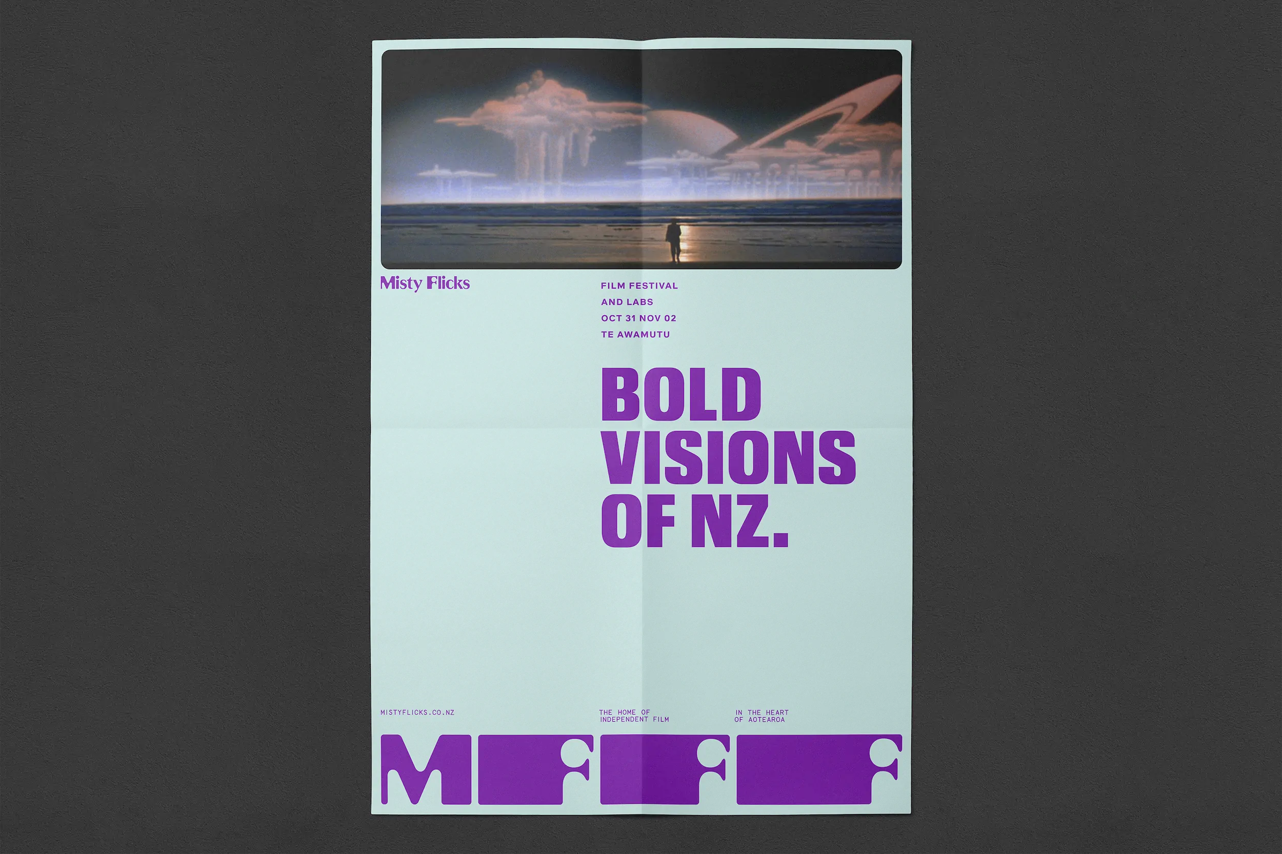 We began by uncovering the heart of the festival: “See the bigger picture” — a strategic idea that speaks to both the power of cinema and the uniquely Aotearoa stories Misty Flicks champions. From this, we developed a brand strategy anchored in authenticity, independence and a proudly local voice. With strategy established, we shaped a full identity system that mirrors the craft of filmmaking itself. We explored aspect ratios, gradients, typographic systems and motion principles, ensuring every component connected back to the cinematic experience. The goal was a brand that feels alive — shifting, stretching and framing stories in a way only Misty Flicks can.