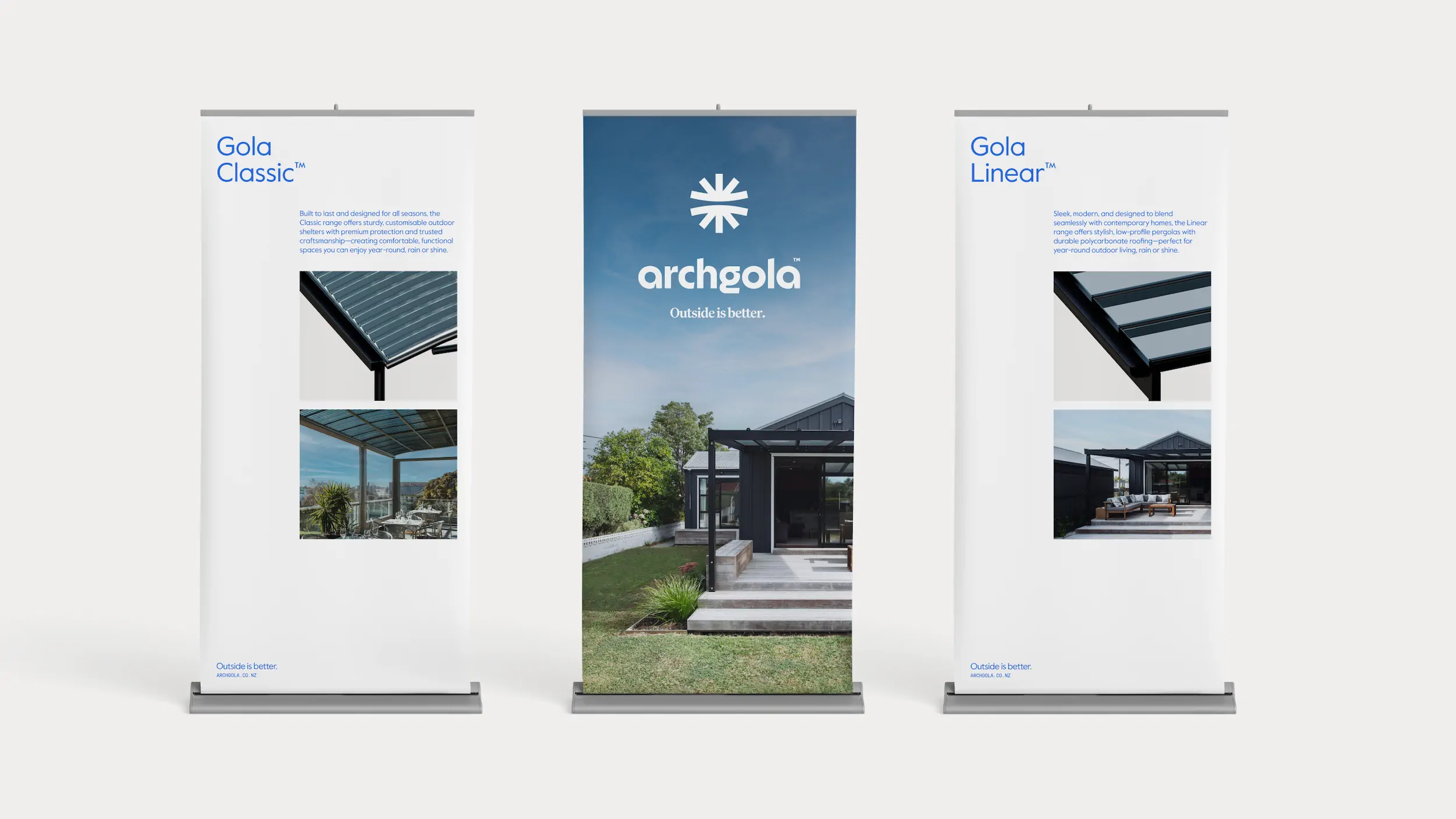 The new brand needed a straightforward, confident look and a conversational voice. The logo system balances warmth and precision. The wordmark, "archgola," is the main feature, looking inviting and relaxed while hinting at engineering. The icon is a stylised blue sun, which captures the simple pleasure of being outside, with its curves suggesting a canopy providing shelter. The core colour is Sky Blue, paired with a range of neutrals. The fonts are sorted into a system for clarity and function: the hero Family is for bold headlines, the everyday Value Sans is the workhorse, and the technical RM Mono is used sparingly for specifications and detail, adding a subtle sense of precision. The language is inviting, relatable, and trustworthy. It uses a touch of Kiwi ease and quiet aspiration, with "Entice" messaging focused on the benefits. Instead of being overly formal, they use lines like "Shade that fits" to highlight customisation, "Engineered for all seasons" for performance, and "It's gotta be a 'gola" to reference their heritage. For deeper emotional engagement, they use sensory lines like "Sun sets. Friends chat. Fire crackles. Beer opens".